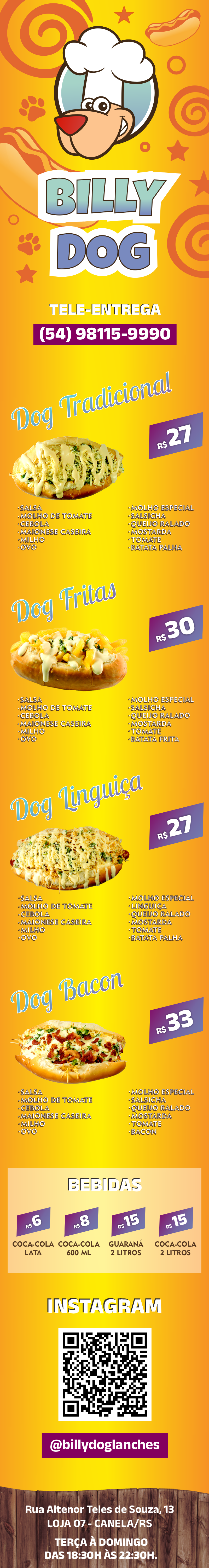 Billy Dog Cachorro quente hot dog canela gramado serra gaúcha tele-entrega dog fritas dog bacon cachorro-quente lanches